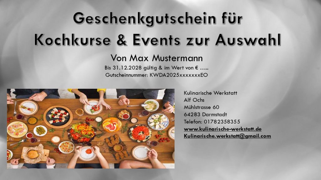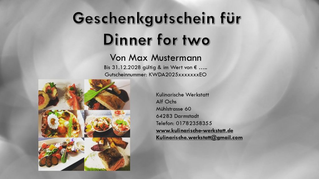 Mit unserem Geschenk-Gutschein besteht die Möglichkeit ein komplettes Event zu buchen, wie zum Beispiel ein Dinner for two, Kochkurs usw. Genauso ist aber auch möglich einfach einen Wertgutschein für einen frei von Ihnen gewählten Betrag auszustellen. Dann kann Ihr(e) Freund(in) oder Mitarbeiter(in) frei entscheiden für welches Event er/sie diesen nutzt. Vielleicht plant er/sie ein Catering, eine Hochzeit oder möchte einfach jemand zum gemeinsamen Dinner einladen.